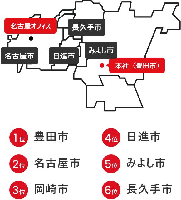 名古屋市に隣接する新興住宅地です。赤池駅、日進駅、米野木駅と駅が多く、名古屋市や本社(豊田市)へのアクセスもラクラク。通学という観点でも交通網が発達しており、お子さまにとっても数多くの選択肢から理想の進学先を選択できる地域です。加えて、地価などは名古屋市よりもリーズナブル。家族連れに人気の地域です。