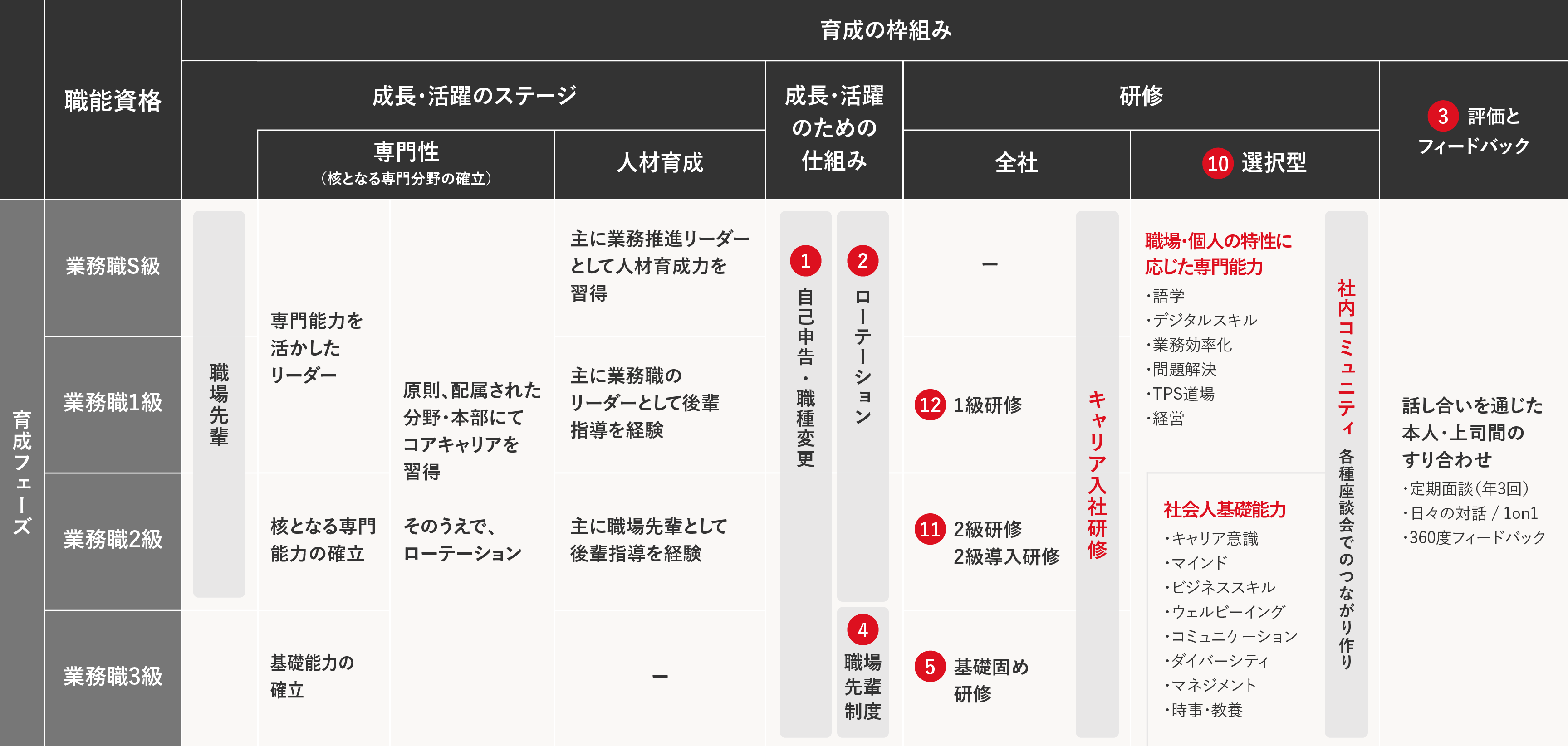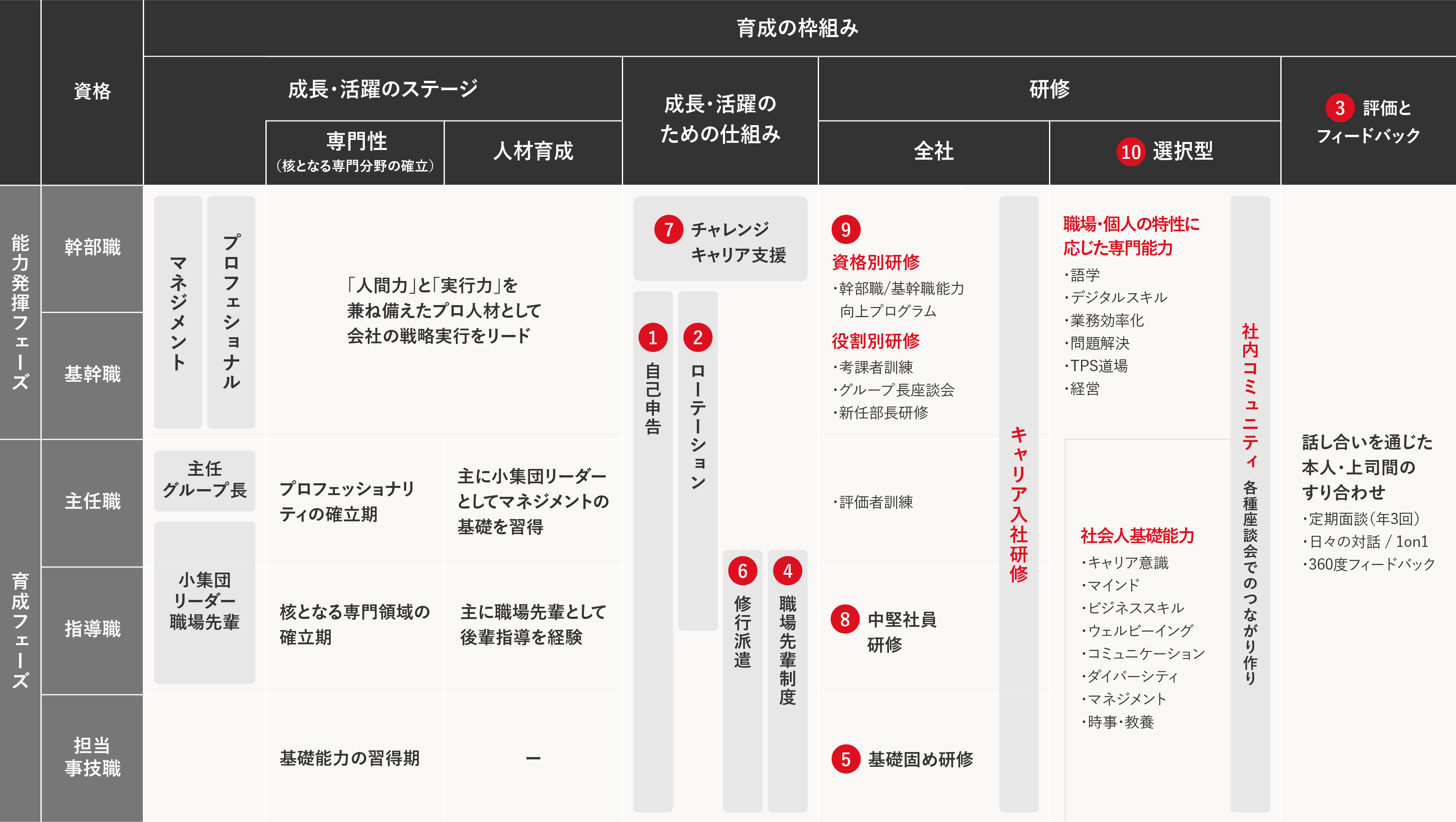 ステージに応じて「トヨタらしさ」を共通で深めながら、「自身の役割や伸ばしたい専門性、学びたい意欲」などに応じて、"選べる"自立選択型の研修制度です。