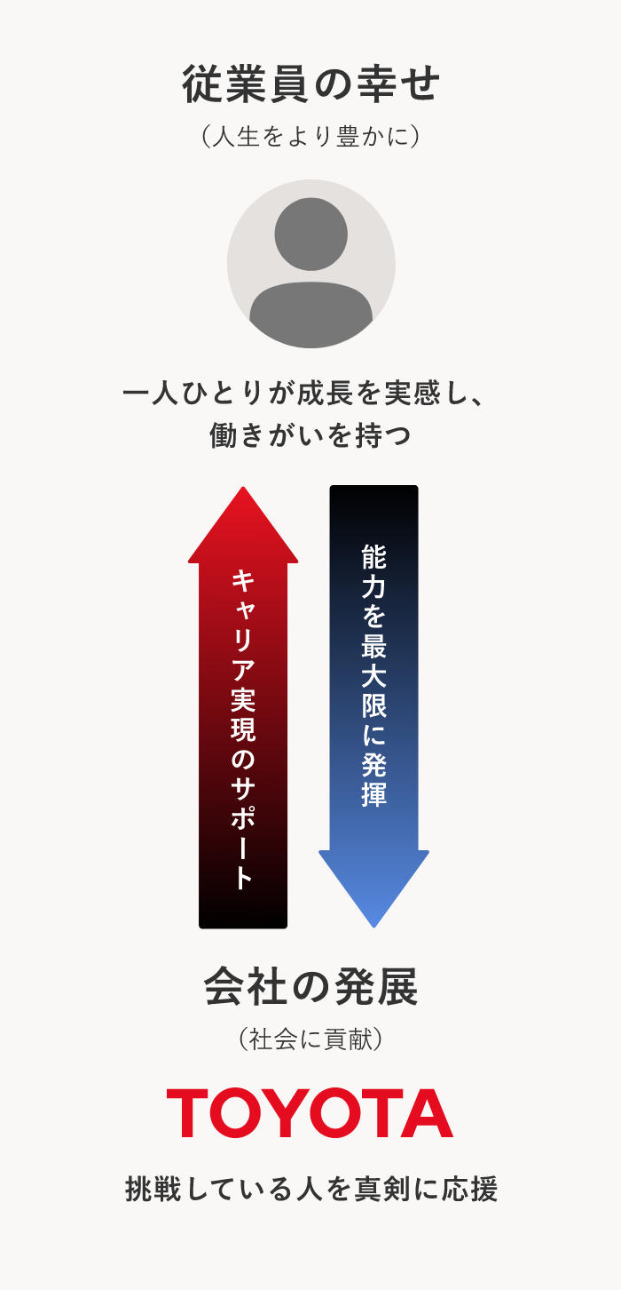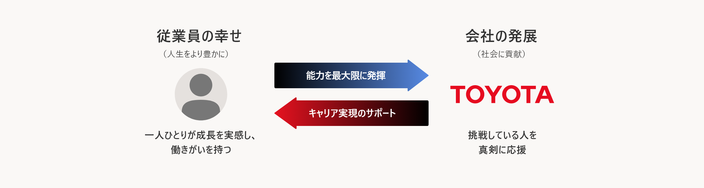 わたしたちは、一人ひとりが仕事のやりがいを見つけ、成長の機会を自ら求めて挑戦することが、会社の発展や社会への貢献につながると考えています。