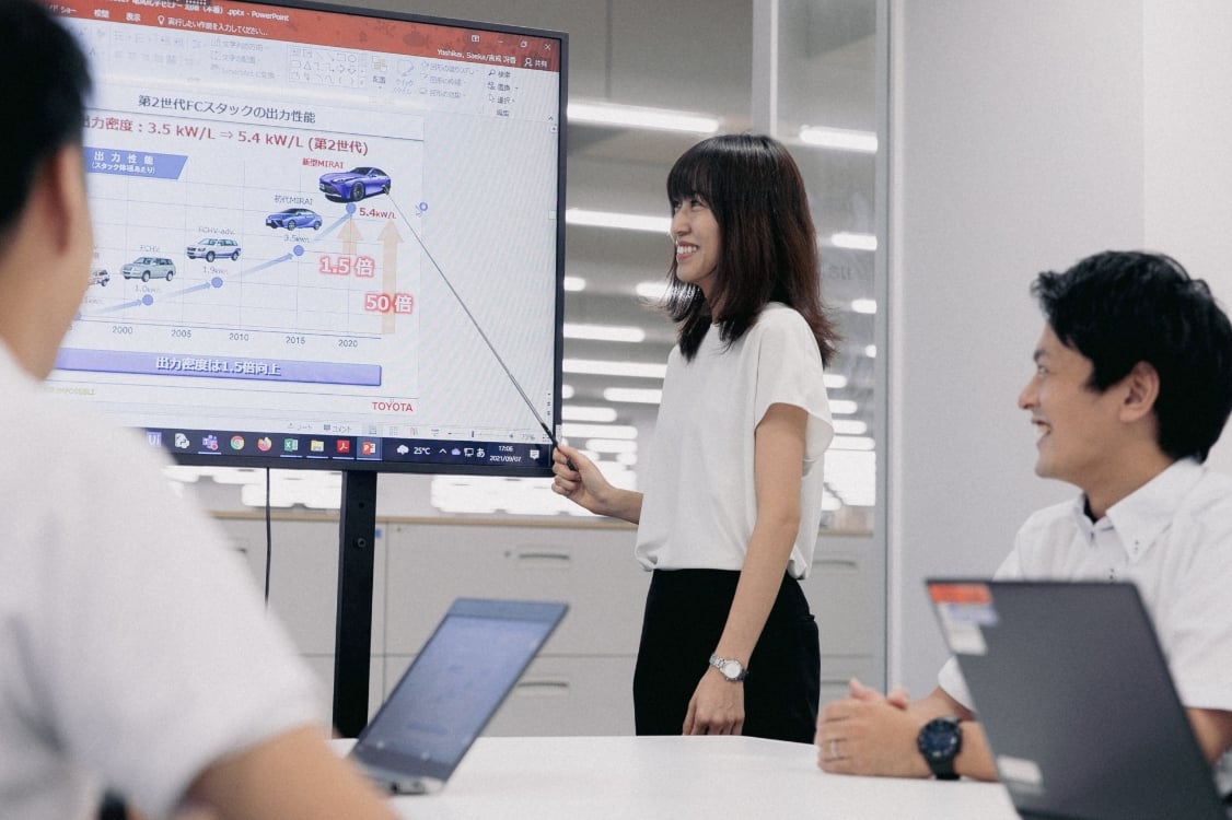 社内の教育は充実しています。燃料電池の教育資料やこれまでの開発で得た知見資料も豊富にあり、それを読むだけでもかなりの勉強になります。トヨタ全体でも、SQCやデータ分析、AIの機械学習など、幅広く先端技術を学べる機会を用意してくれるのが嬉しいですね。社内の教育・研修制度を活用することで、独学では得られないことをたくさん得られました。 また、先輩方のサポートも大きな魅力です。たとえば、実験をする前は、自分の中で考えて仮説を立てるのですが、そのときに「こんな成果を得られるはず」と先輩に共有します。先輩には、1世代のMIRAIをつくった方がたくさんおり、本当に豊富な知識を持っておられます。しかも皆さん、私の提案についてしっかり耳を傾けいろいろなアドバイスをしてくださるので、目から鱗が落ちる瞬間がたくさんありました。 一番の学びは、先輩からの「データは嘘をつかない」というアドバイスです。トヨタのあたたかい風土を活かして、早く一人前になれたら嬉しいですね。
