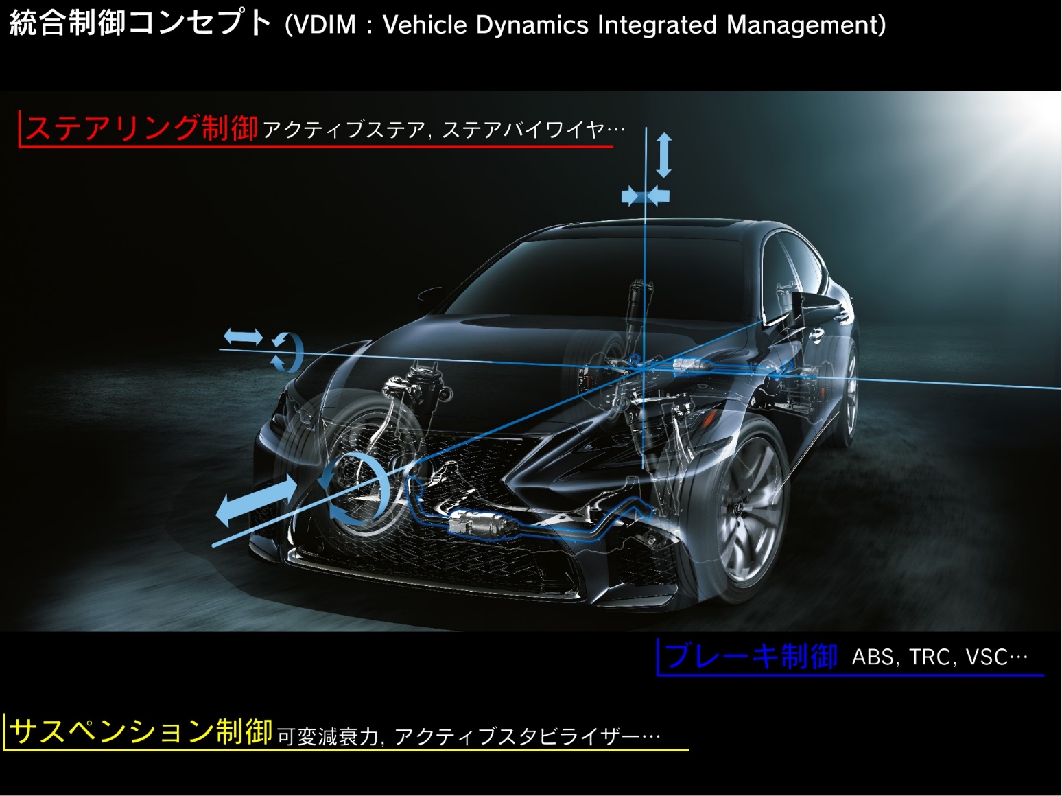 基本的なメカ設計に加えて、近年では制御技術を活用した車両運動性能の向上にも積極的に取り組んでいます。サスペンション、ステアリング、ブレーキ、それぞれのアクチュエータを単体制御するだけでなく各機能を協調させることで車両全体の動きを管理するVDIM(Vehicle Dynamics Integrated Management)というコンセプトをベースとしさらなる運動性能向上、安全性向上を実現しています。