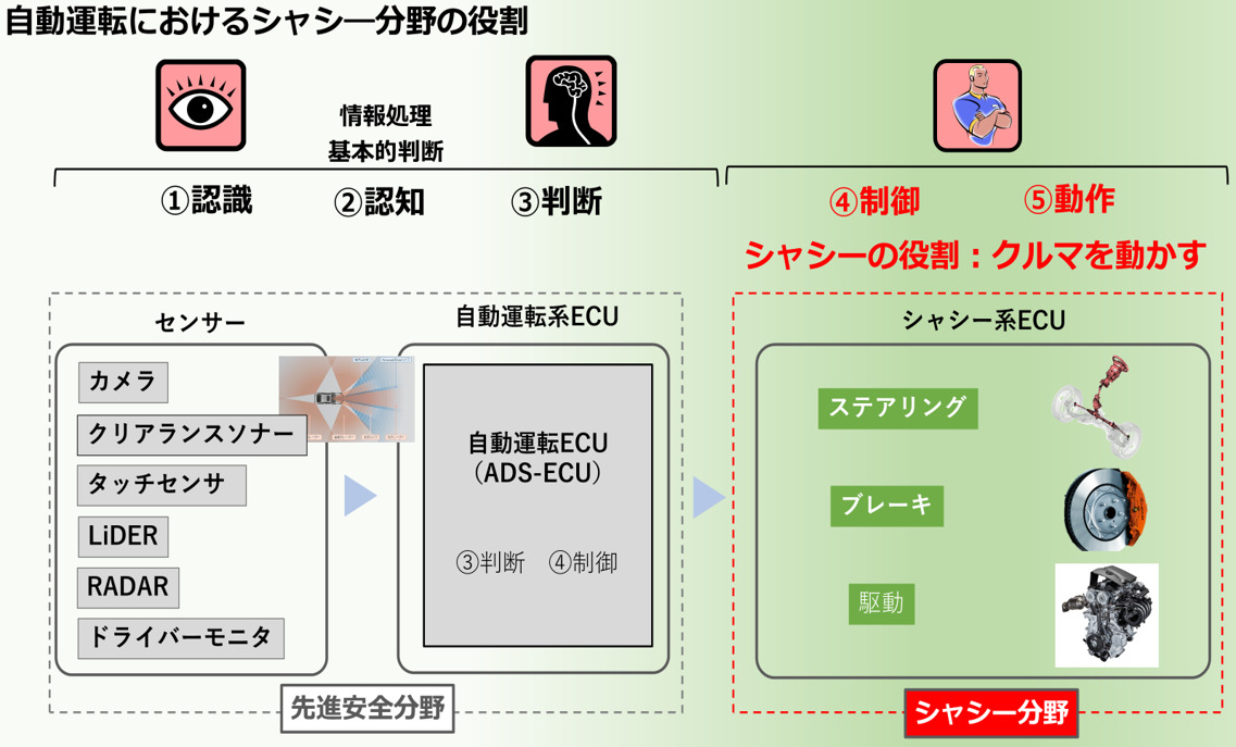 シャシーコンポーネント設計、ステアリング・サスペンション・ブレーキ制御技術開発、統合制御開発(自動運転含む)