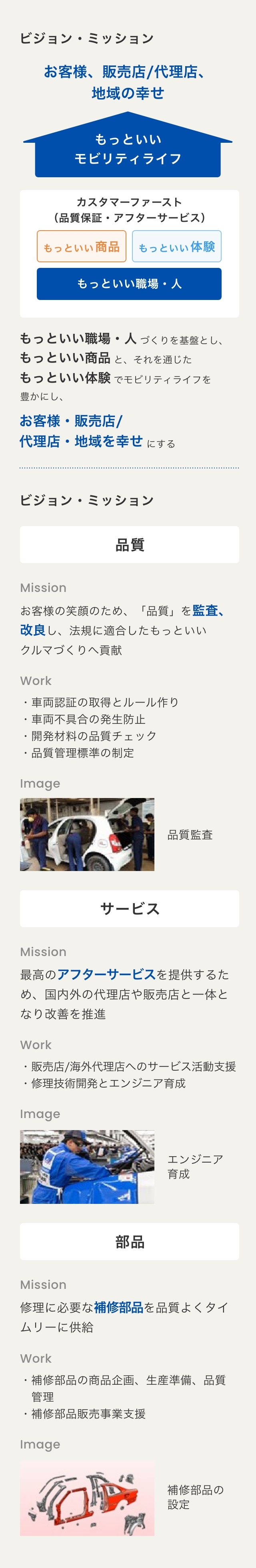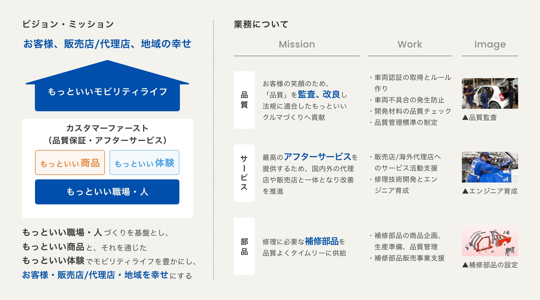 「品質保証」と「アフターサービス」を通じて、お客様に寄りそう安心・安全なモビリティライフを実現する