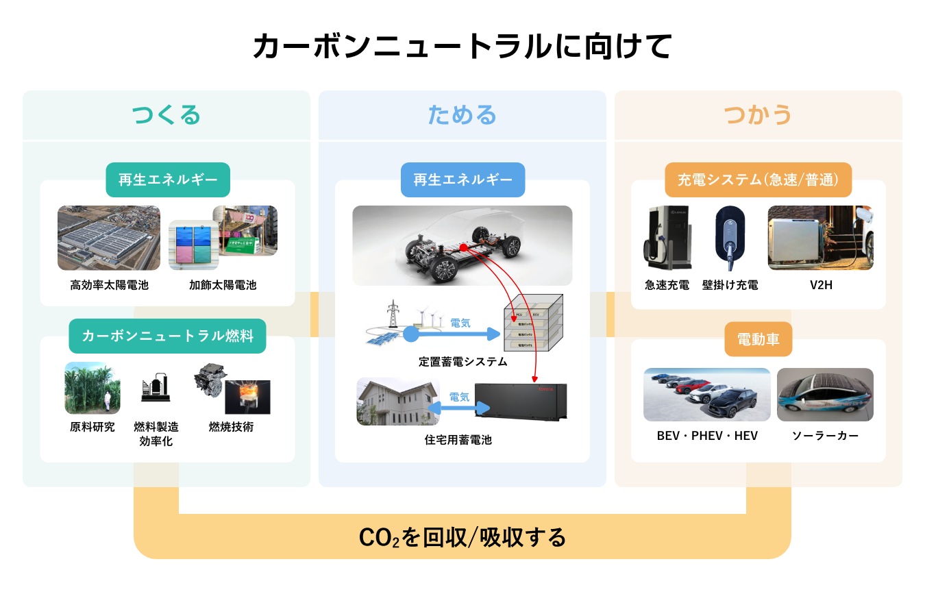 カーボンニュートラル実現のためのビジネス/技術の弾込め。「つくる」「運ぶ」「使う」「廃棄する」という、すべてのプロセスでCO2 削減を実現するため、環境戦略の作成や、CN燃料の活用/製造開発(太陽電池・バイオ燃料などの新技術開発や事業化検討、水素社会実現に向けての施策の提言や普及活動等)、革新的な電動コンポーネントの開発を推進。