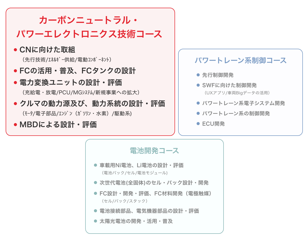 電気や次世代エネルギーに向き合い、動力源や、動力源から発生したエネルギーを効率よく利用するためのユニット・装置類の先行から量産までの開発・設計を担う。