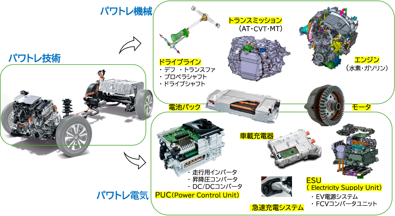 クルマの「走る」・「曲がる」・「止まる」を司り、燃費や安全性を向上させる技術で電動化を推進していく。