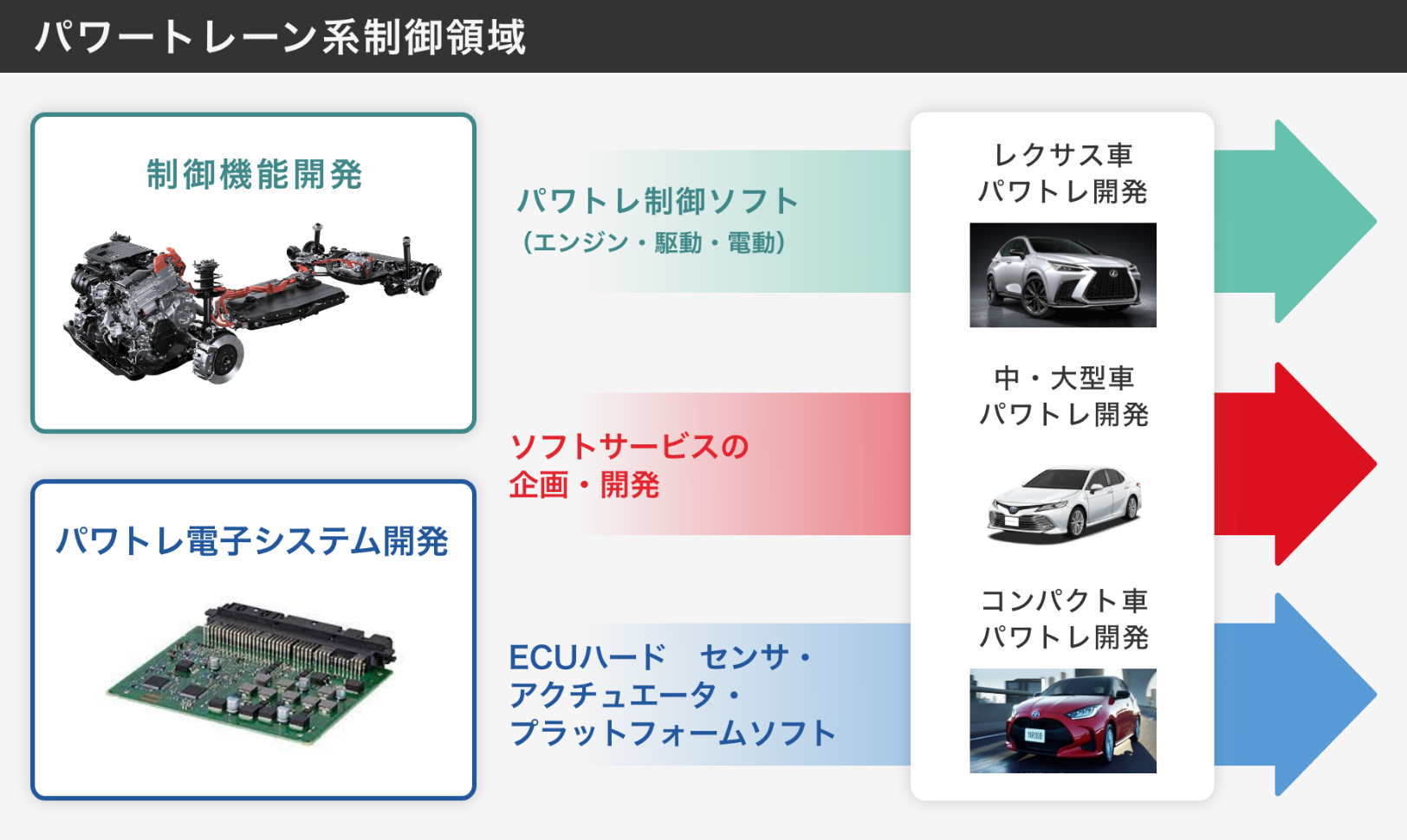 パワートレーンの制御開発、評価等の量産開発、ガソリン車、HEV、PHEV、FCEV、BEV等のすべての動力源であるパワートレーンの制御開発